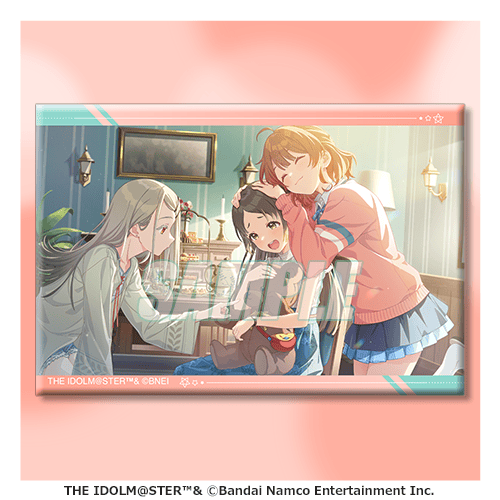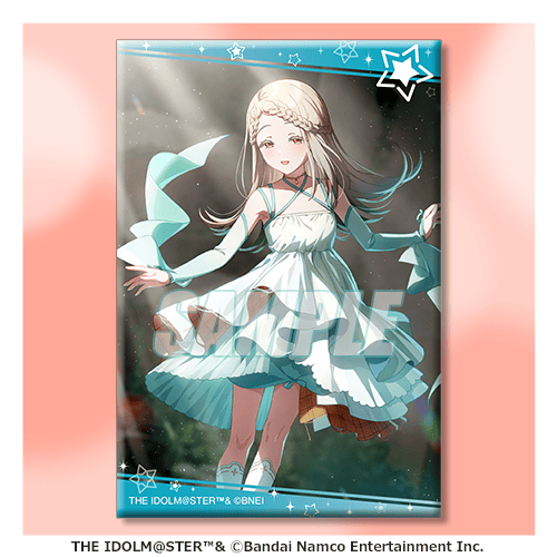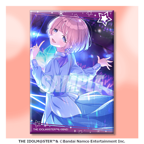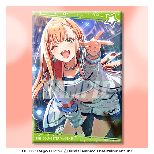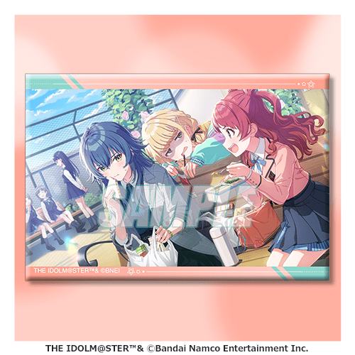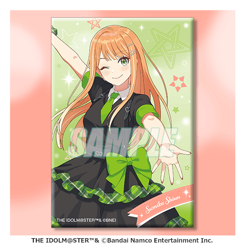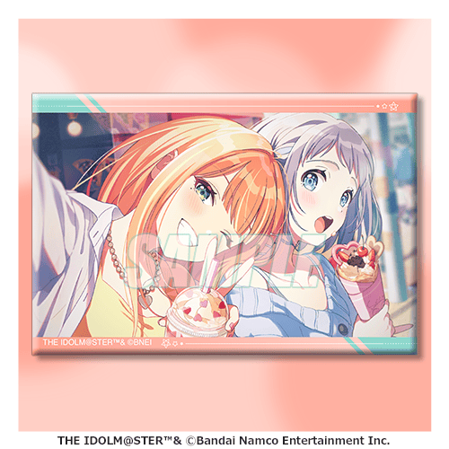 描き下ろしイラストと、プロデュースカード、サポートカードをデザインしたスクエア缶バッジです。